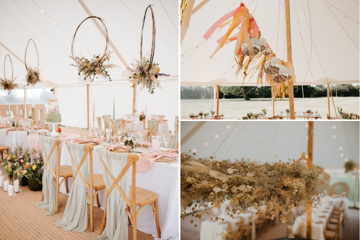 Hanging decor can transform a marquee from simple to stunning. Consider draping fabric from the ceiling in soft waves to add elegance, or go bold with floral installations or tall trees. You can also string rag bunting or festoon lights to bring a fun, whimsical touch. The height of the marquee gives you the opportunity to draw eyes upward, so take advantage of it!