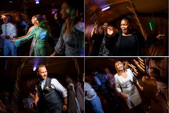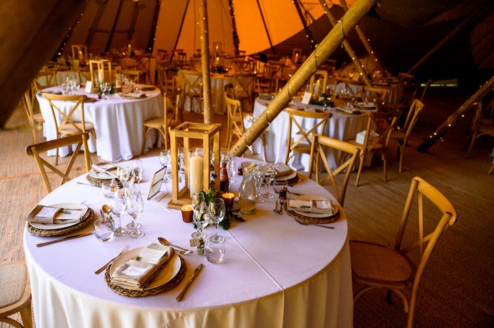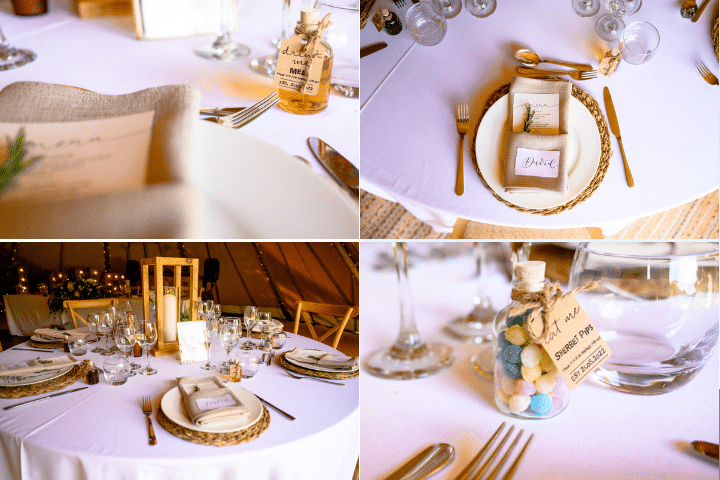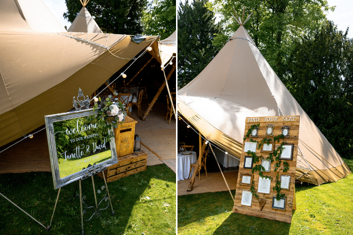 Dave and Janette had originally booked Two Giant Hat Tipis but decided to increase their celebration size to Three Giant Hat Tipis. This gave them more space for the round tables they wanted along with all of the personal details they wanted to add to their celebration space.